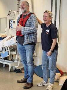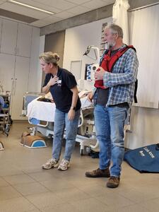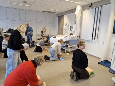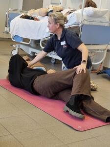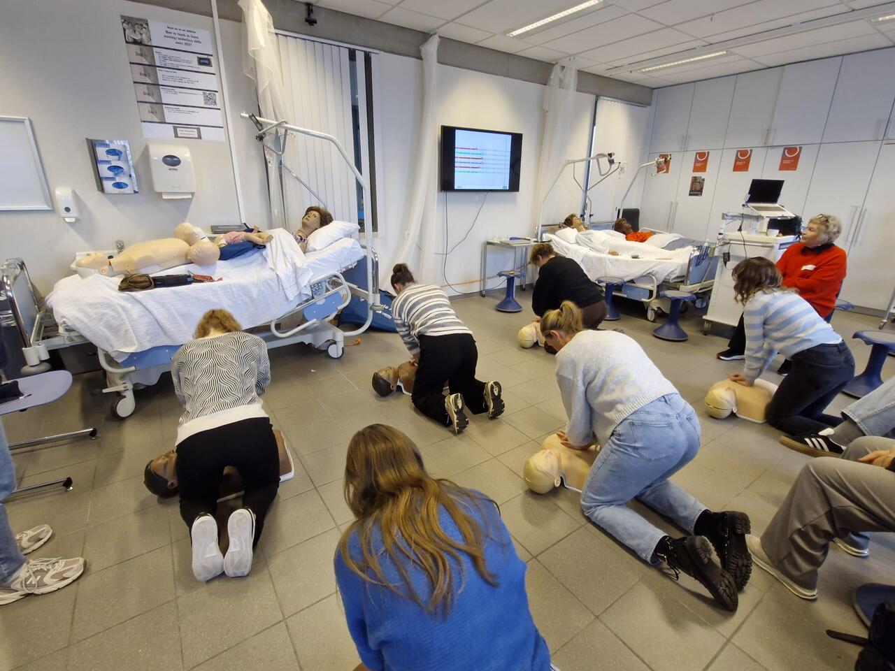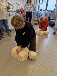 Alle medewerkers van Mekanders volgen om de 3 jaar een basis- of opfrissingscursus EHBO. De docent van Thomas More legt alles geduldig uit en kijkt toe op het correct toepassen van de opgedane kennis op proefpersonen -en poppen.