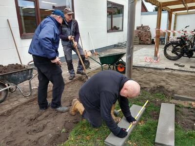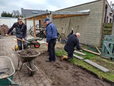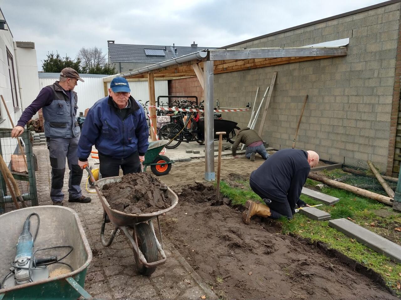 Polyvalent technisch medewerker, Nick en vrijwilligers Ronny, Jan en Bert maken werk van een nieuwe fietsenstalling.