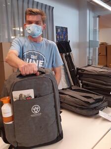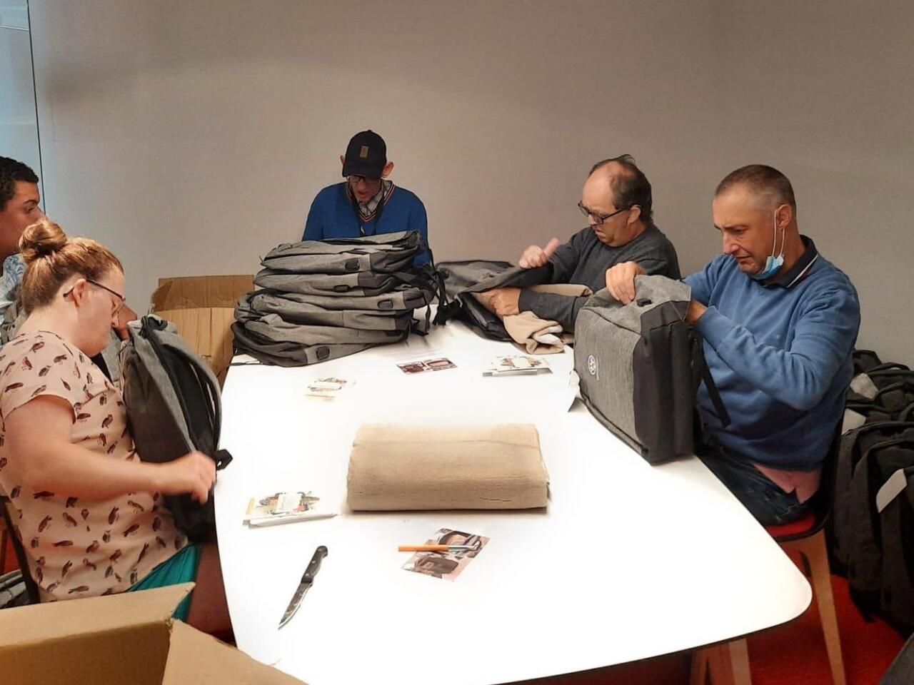 Het vullen van rugzakken voor alle huishoudhulpen van Dienstenthuis uit Turnhout kwam als een geschenk uit de hemel voor Dirk en Fenja. Leuk alternatief werk dat zij heel graag uitvoerden in het kantoor van Dienstenthuis in Turnhout.