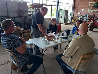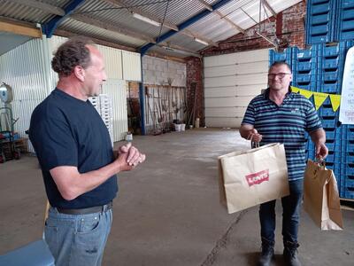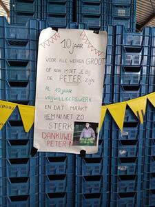 Jacques en Martine zetten Peter in de bloemetjes voor zijn jarenlange trouw. Op deze feestelijke dag was ook Tom weer van de partij. Wat een leuke weerzien! En Peter, die is alvast van plan om nog minstens enkele decennia op hetzelfde elan verder te doen.