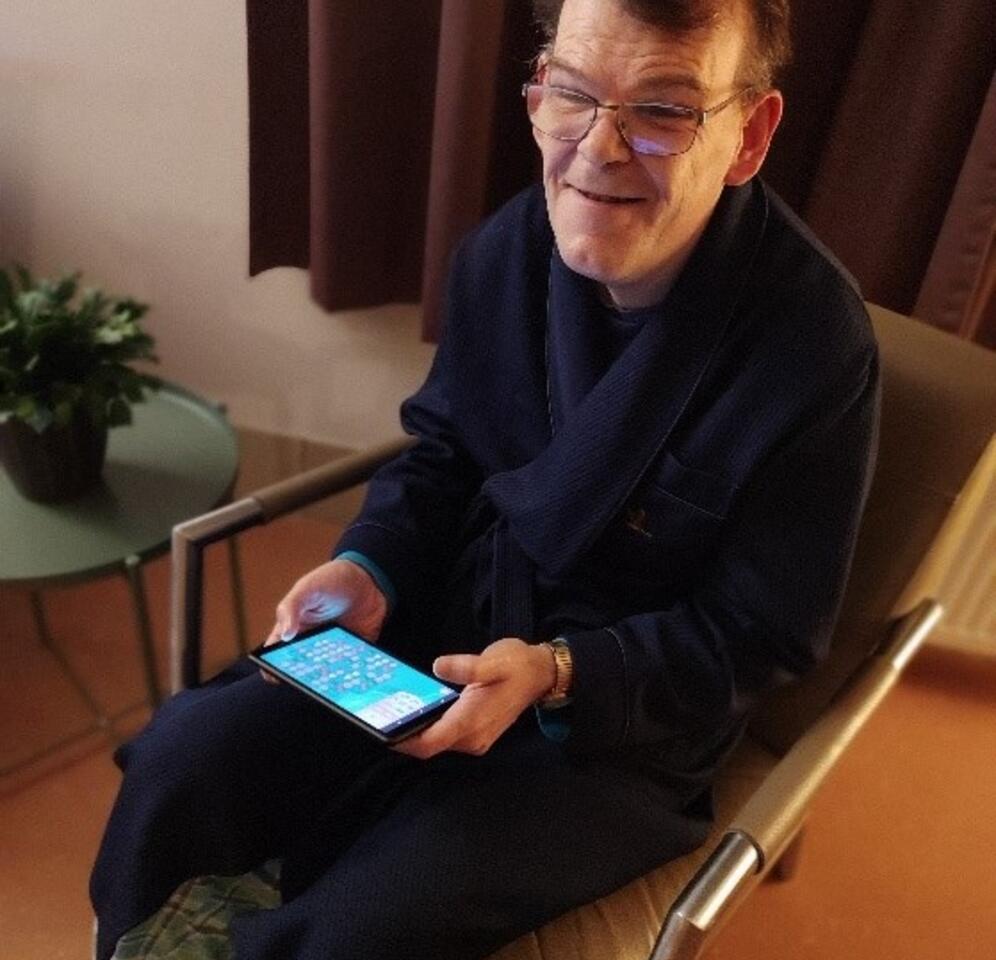 Maar de tablet is multifunctioneel! Sommige bewoners gebruiken het om muziek te beluisteren. Anderen spelen er dan weer spelletjes op. Of is er iemand die geen zin heeft om ’s avonds naar de familiesoap te kijken? Geen probleem! We halen de tablet erbij en zetten een nostalgische aflevering van ‘FC. De Kampioenen’ op!
