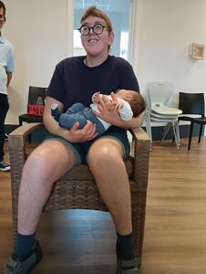Om het helemaal leuk te maken kwam Fran al op bezoek met die mooie, brave Maurice. En wij mochten hem zelfs op onze schoot pakken en pap geven.