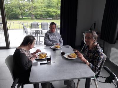 In De Villa wacht hen ’s middags een lekkere warme maaltijd met frietjes. Emilia, Maike en Kriek hebben nog voldoende energie over om in de namiddag iedereen te verwennen met heerlijke smoutebollen.