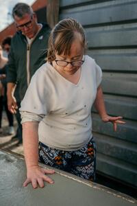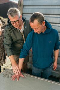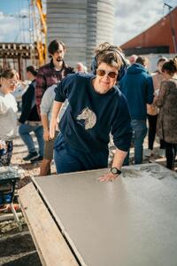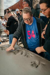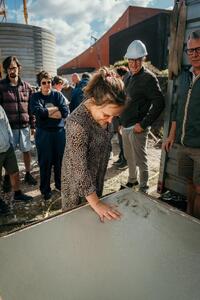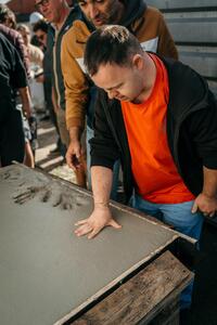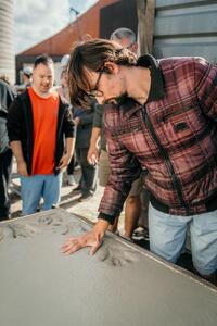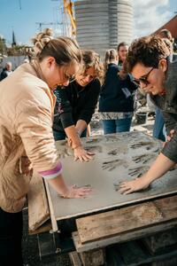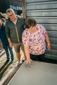 De bewoners en begeleiders van Goriën zetten hun handafdruk in een symbolische eerste steen van hun toekomstige nieuwe woonplaats in Retie-Schoonbroek. De plaat zal op een mooie plaats geïntegreerd worden in het gebouw.