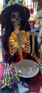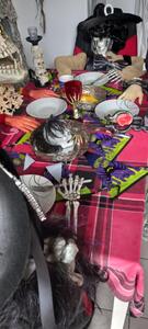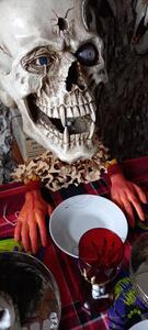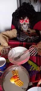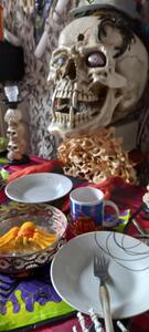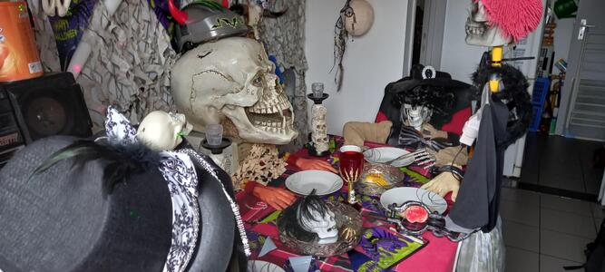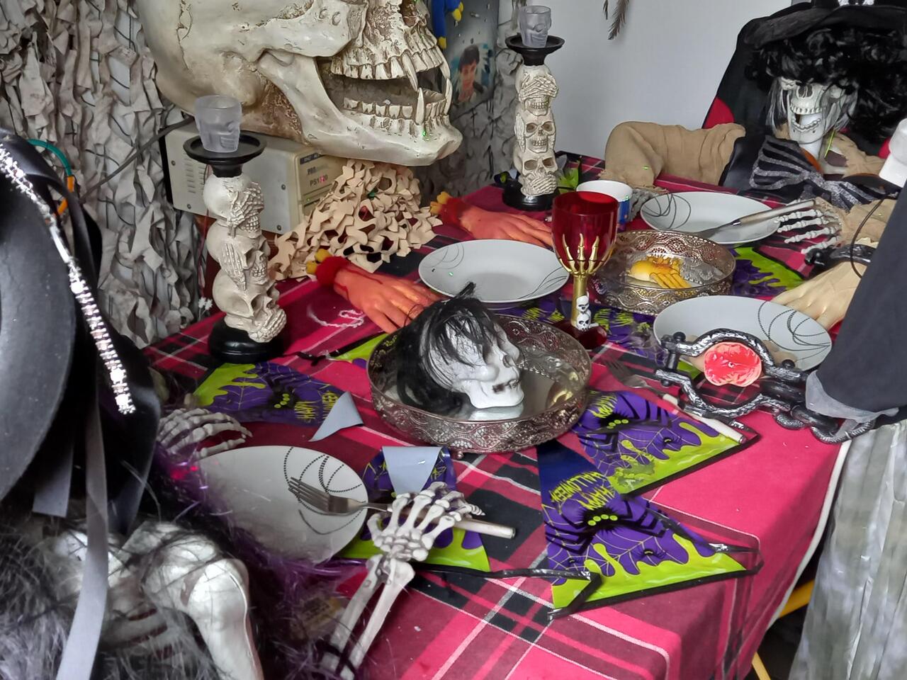 Dit jaar zit een familie skeletten te tafelen in zijn huis. Zelf kan hij nu tijdelijk zijn tafel niet gebruiken, maar dat vindt hij niet erg.