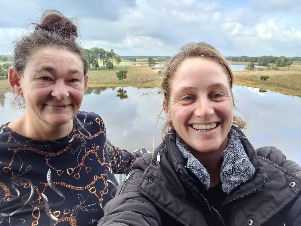 Reinhilde en haar begeleider Sara profiteren van het mooie weer en fietsen een eindje langs het Bels Lijntje tot aan de kijktoren. Daar genieten ze van het prachtige uitzicht over het Turnhouts Vennengebied.